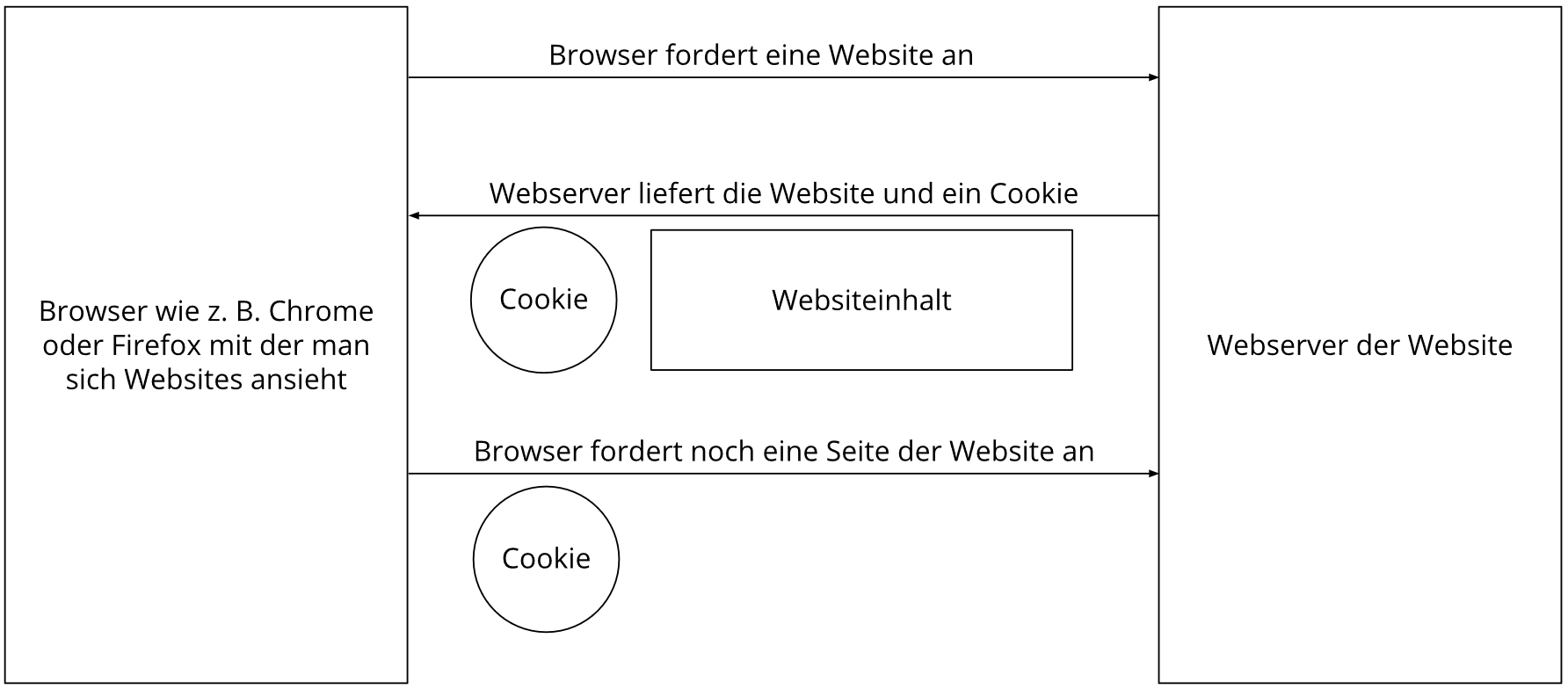Die folgende Grafik zeigt eine mögliche Interaktion zwischen einem Webbrowser wie z. B. Chrome und dem Webserver. Dabei fordert der Webbrowser eine Website an und erhält vom Server ein Cookie zurück, welches der Browser erneut verwendet, sobald eine andere Seite angefordert wird.